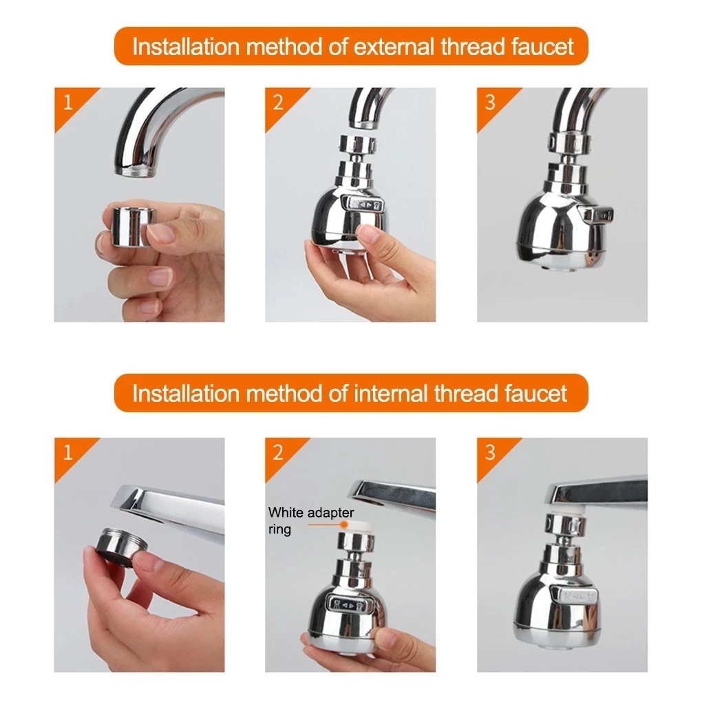 Langkah 1 : Cabut kepala paip yang asal Langkah 2 : Pasang Kepala Paip Boleh Putar Langkah 3 : Kemaskan supaya tidak bocor